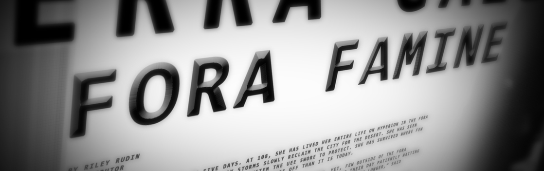 HYPERION, FORA: Sophia Ruiz hat seit fünf Tagen nichts mehr gegessen. Die 108-Jährige hat ihr gesamtes Leben auf Hyperion im Fora-System verbracht. Sie hat miterlebt, wie die Wüste mit den Hyper-Staubstürmen die Stadt langsam zurückerobert hat. Sie musste mit ansehen, wie Banditen und Geächtete die Kontrolle über ein System übernommen haben, dem die UEE geschworen hatte, es zu beschützen. Sie hat dort ausgeharrt, wo es nur wenig andere geschafft haben und sie hat ihre Welt noch nie in so einem schlimmen Zustand erlebt wie heute.